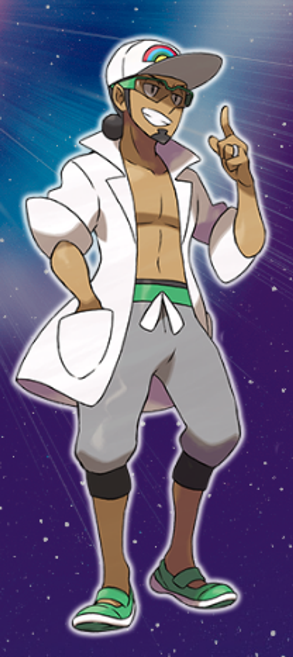 Now then, this strangely attractive male character is the professor of the Alola Region and, most likely, the person to give you your first Pokémon in the game. He wears his lab coat over his bare torso and is passionate about Pokémon research. To cary on the Pokémon Professor tradition, he is also named after a tree. I can already sense the amount of fan-fiction that will include this character.