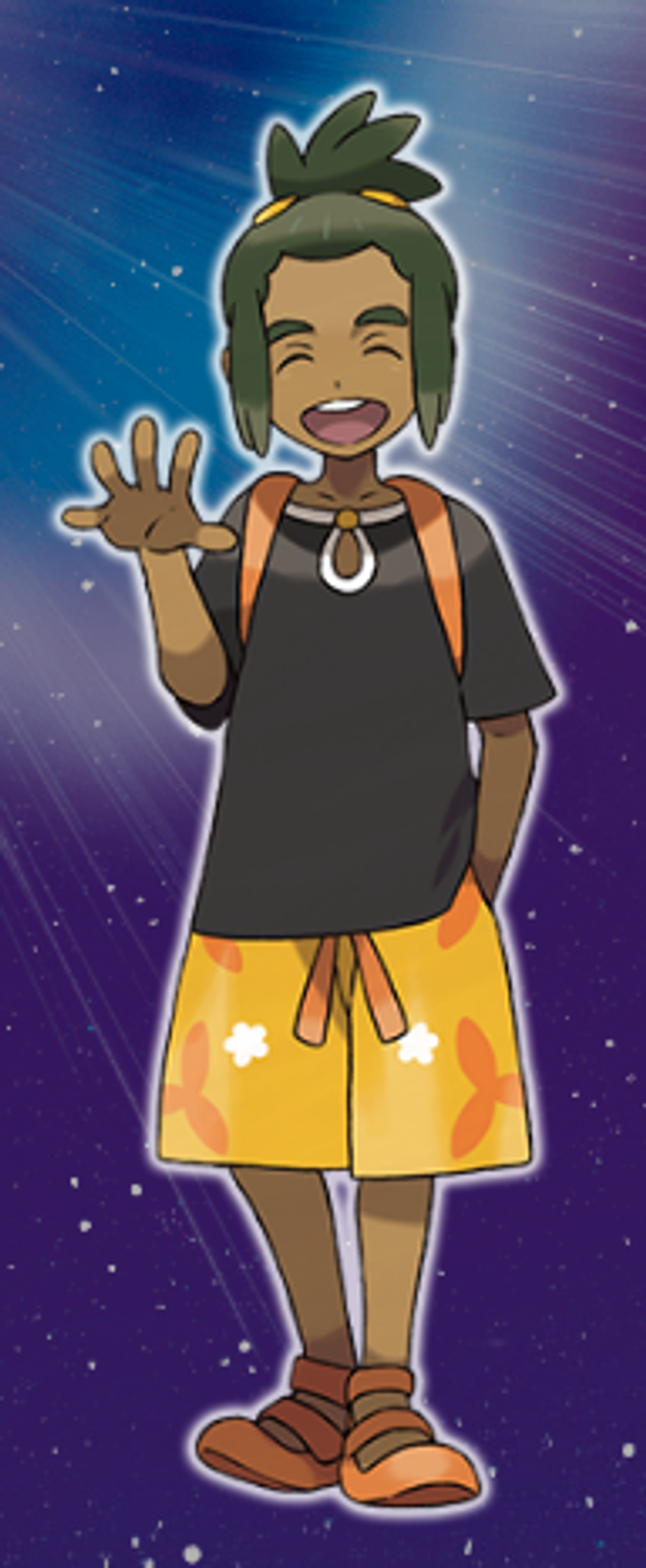 Hau is one of the main character's first friends and overall rival in the game. But unlike the rivals in earlier Pokémon games, he seems really amiable. His character description talks about his big heart and his love for malasada.
