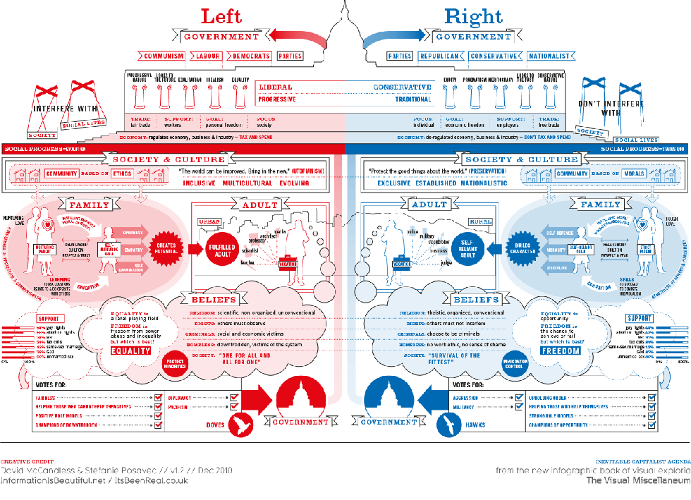 At a time when the country is as divisive as ever, people need to understand the fundamental principles of a particular political ideology and where they stand on certain issues. This will allow individuals to find a consensus among other political ideologies and unite under solving common issues. The Pew Research Center has a helpful quiz that gives an ideology that relates most to your views and beliefs. Please visit http://www.people-press.org/quiz/political-typolog... to find out. The website Information Is Beautiful provides a wonderful infographic on the two main political bodies - the 'left' and the 'right'.