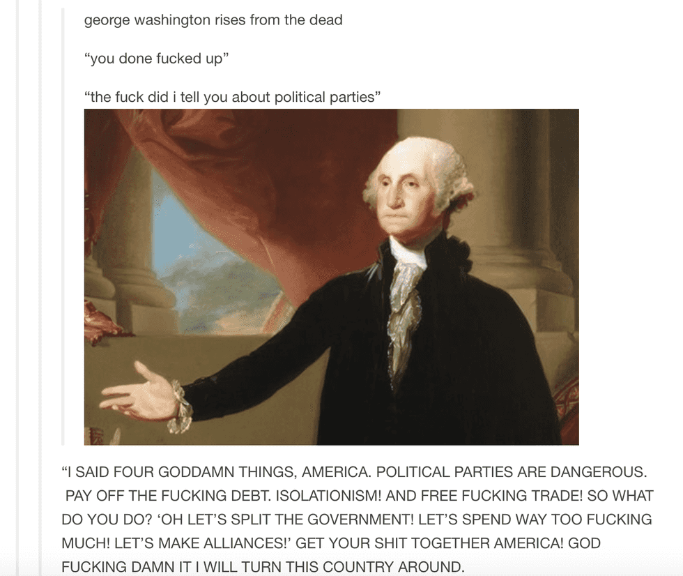 George Washington warned the Founding Fathers about political parties. If you didn't know, political parties are not mentioned in the Constitution at all.