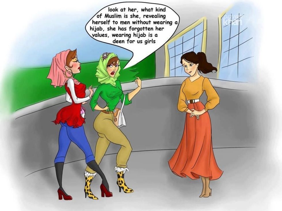 Meanwhile, in the western world these types of Muslims who wear hijab but non-western clothing would be considered practicing by non-Muslims, but as archaic and backwards by members within their Muslim community who promote assimilation and conformity to western norms (this also includes women who do niqab, burqa, and abaya):