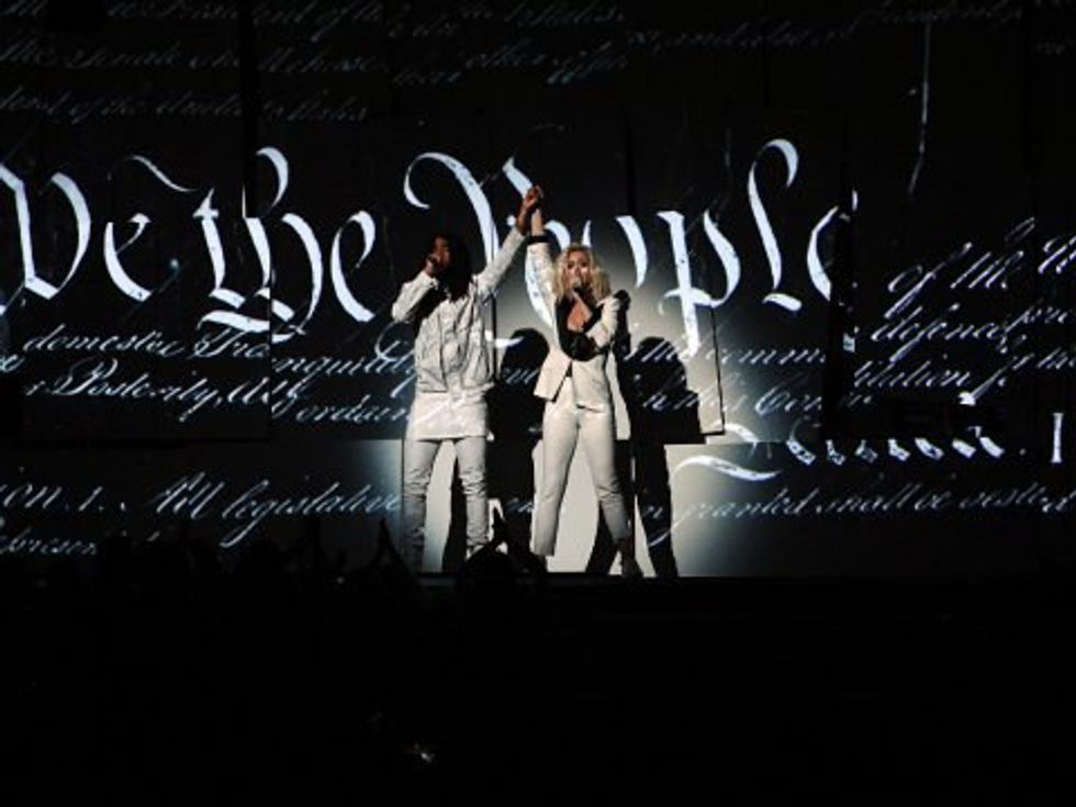 Katy Perry began her performance of “Chained to the Rhythm” behind a white picket fence. Wearing a white pantsuit, planned parenthood pin, and an armband with the word, “persist” written on it, Perry jumped about the stage as it deteriorated into what appeared to be a man-powered rotating disco ball. After the white picket fence was removed, Perry was joined by Skip Marley at the end of the song. In the performance’s final moments, Perry and Marley stood against the backdrop of a makeshift house while projections of the Constitution crawled up the side.
