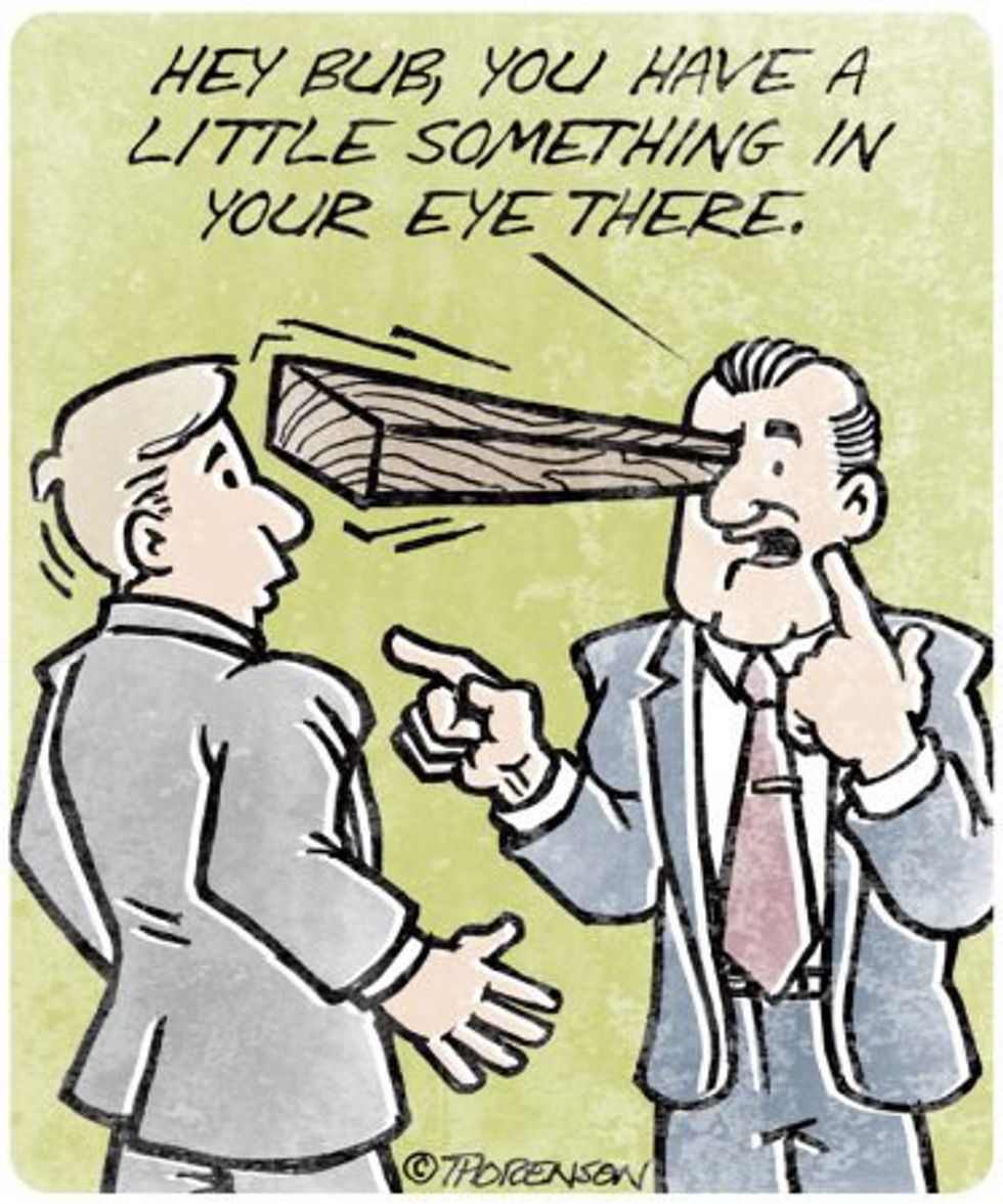 This reminds me of when Jesus was giving his "Sermon on the Mount" and he said, "Why do you look at the speck of sawdust in your brother’s eye and pay no attention to the plank in your own eye? How can you say to your brother, ‘Let me take the speck out of your eye,’ when all the time there is a plank in your own eye? You hypocrite, first take the plank out of your own eye, and then you will see clearly to remove the speck from your brother’s eye" (Matthew 7:3-5).
