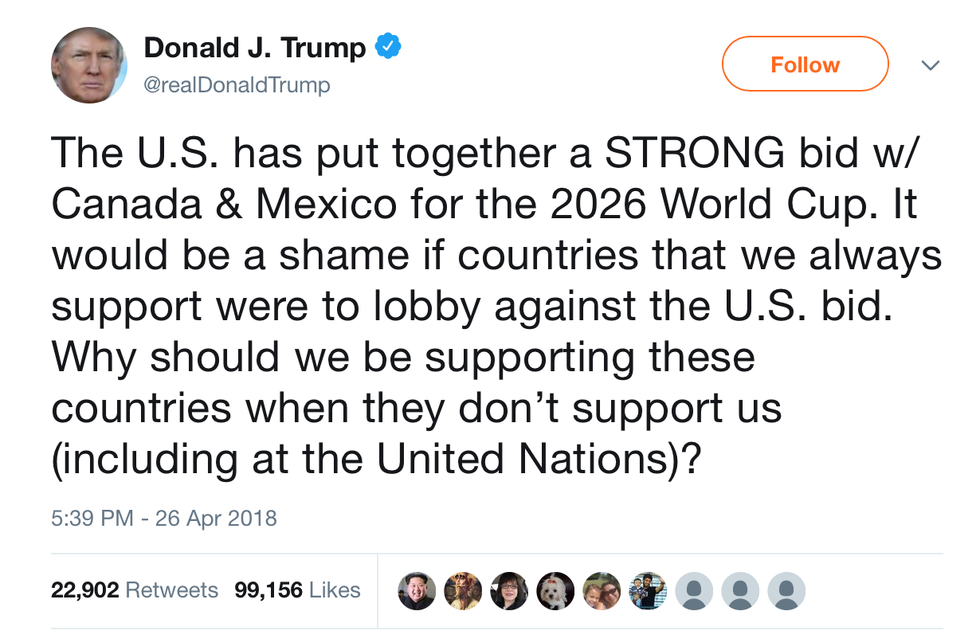 It is clear that regardless of what one thinks of Trump's policies, he is getting behind the joint World Cup bid. While that is good in and of itself, is threatening the bid's opponents through the UN negotiating power the right way to get other nations-- who vote of the winning bid-- to get on board? I don't know. I don't think the rest of the world has quite figured him out yet either. What we do know, though, is that if the North American coalition wins, the continent will put on a great festival for the rest of the world.