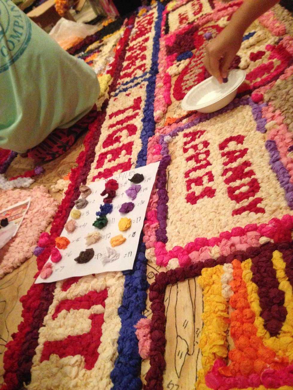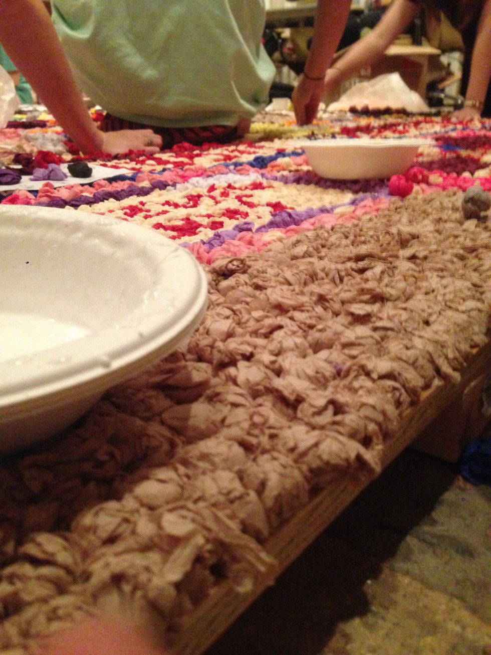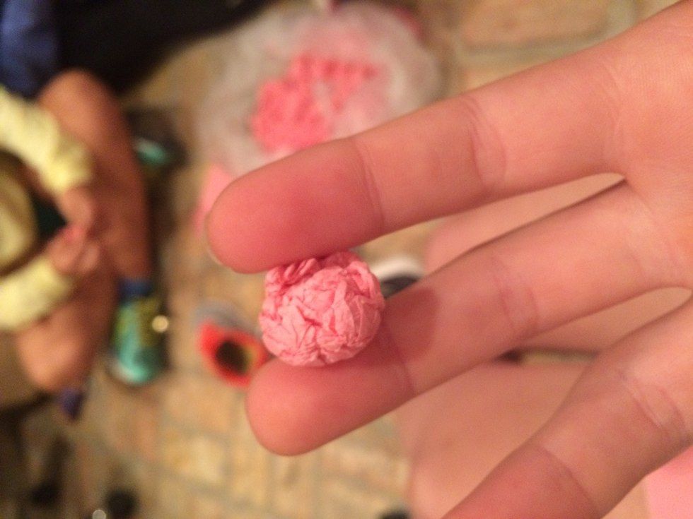 A pomp is made by rolling a square piece of colored tissue paper into a very tight little ball. The pomps are then glued to the board/object, and by using different colors, an image of absolute school spirit emergeges. Why not just paint signs? Because what is the fun in that anyway? We're not painting signs for our high school football team anymore. This is serious.