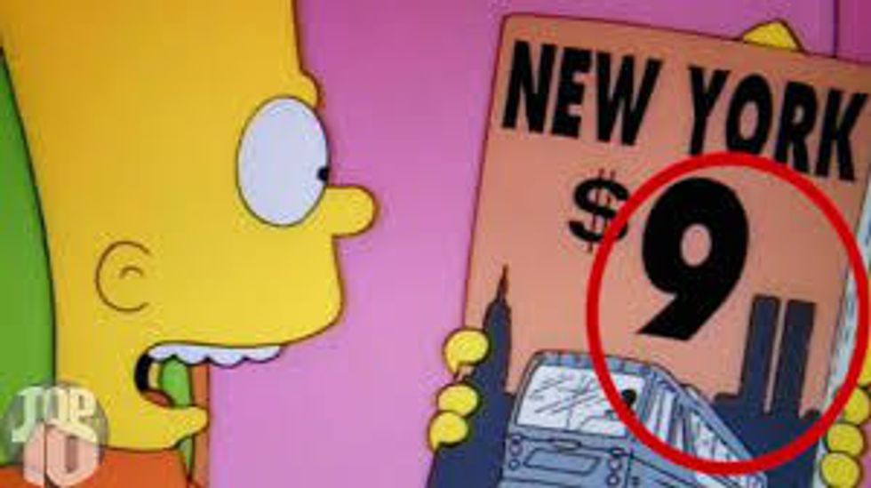 The Simpsons episode, "To Surveil with Love" aired May 2, 1997. Bart is looking at a magazine about New Work with the dollar sign by a big 9 with two towers beside it. The graphic creates 9/11.