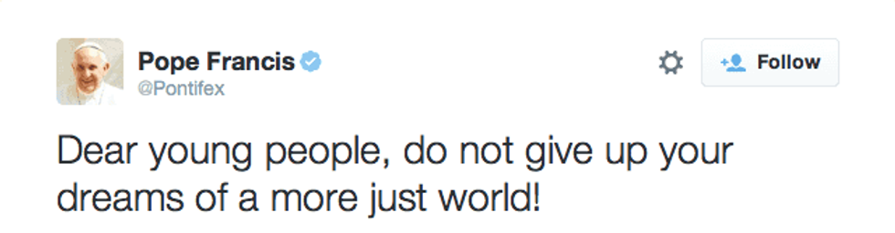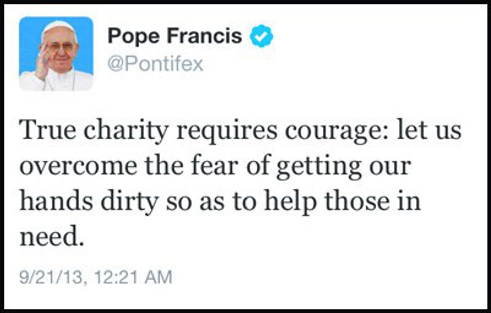 @Pontifex, in my opinion, offers any individual short blurbs of guidance every time he tweets. Although he is the main figurehead for the Catholic Church, Pope Francis is a cute, older man who not only has wisdom beyond words, but is able to communicate Catholic teachings to everyday people. No matter what religious affiliation you may have, it is possible to gain insight on how to live better through his posts, even if they may be Catholic in nature. Even in a world that has somewhat strayed from religion, Pope Francis is able to communicate Bible passages to those who may not be fully educated on them. The Bible is often steered away from just because it is considered to be too strict or too conservative, but it offers lessons that any individual, religious or not, could follow. Whether you are in a tough spot in life, or are looking for ways to enlighten yourself and become a better person all around, Pope Francis is speaking to you. Here are some examples, of my personal favorites, that I believe everyone deserves to see.