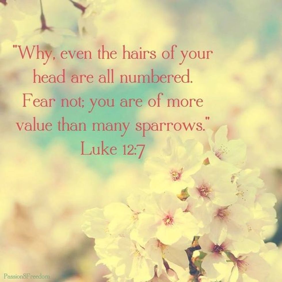 14. "Indeed, the very hairs on your head are numbered. Don't be afraid; you are worth more than many sparrows."-Luke 12:7