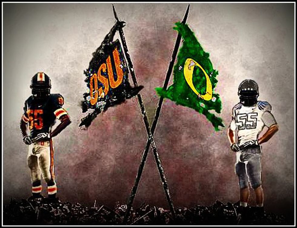 With no NFL team to root for, our attention is turned to the collegiate level when it comes to football. Unless it's the Civil War, most of the time you can cheer for both (kind of), but when the rivalry game comes around, you have to pick a side, no platypuses. (Go Beavs.)