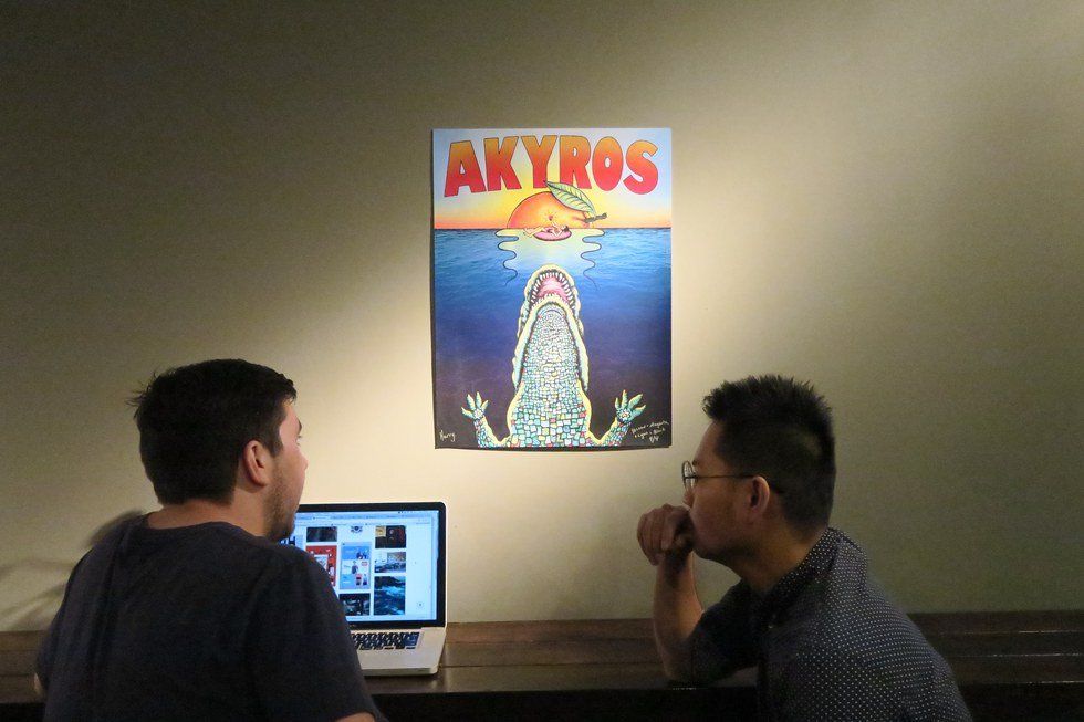 I sat down at the table nestled against the window, where Harry Foreman was sipping on a cold brew. Under the name "Akyros" (Greek form: άκυρος, which means to "cancel"), he had hosted a printing show directly behind this table at Vespr Craft Coffee.