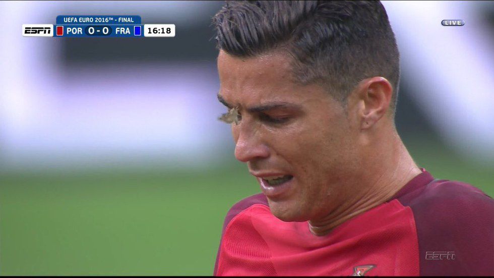 One of the most heart-wrenching moments of yesterday's game was watching Cristiano Ronaldo buckle from a knee injury in the seventh minute after a collision with France's midfielder Dimitri Payet. At first, it did not seem like it would pose a problem to Portugal's 31-year-old superstar player, but as the game continued, his face revealed otherwise. Ronaldo was reluctantly taken out of the game on a stretcher in the 25th minute.