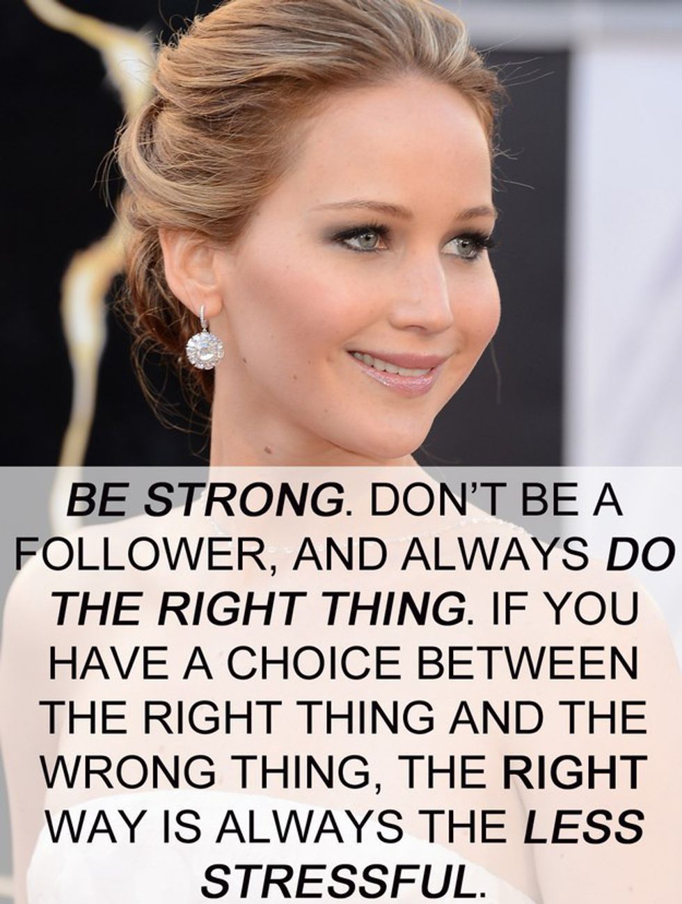 JLaw is just really cool, in general. Aside from being an Academy Award-winning actress, she strives to be the voice for women everywhere. Jennifer Lawrence recently wrote an essay about the gender pay gap in Hollywood, unveiling the truth of what it's like for struggling, hard-working women everywhere. In addition, she is just constantly saying kickass things about being an individual, not giving a shit about what anyone else thinks, and overall being a powerhouse. She's right. It's time for people to stop worrying so much about what other people have to say, and time to start worrying about the things we can change and have control over. Following the crowd will not get you far, but doing things the way you want in order to be great? That's something to strive for. As cheesy as it sounds, being your own, confident person will take you places. Just look to Lawrence for guidance on how to do so.