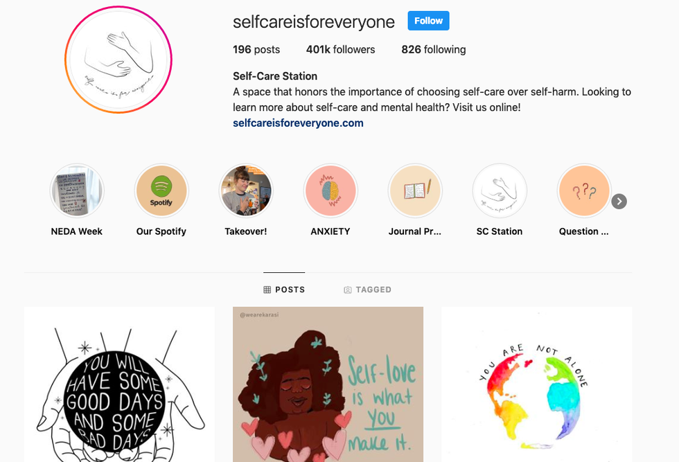 @selfcareisforeveryone is a page made by Self-Care Station, a website that sells mental health clothing and donates 10% of sales to the National Suicide Prevention Lifeline. Self-Care Station also provides resources against self-harm and suicide. Their Instagram feed is full of colorful and inspiring graphics (made my many artists) and a positive community of people who share their mission.