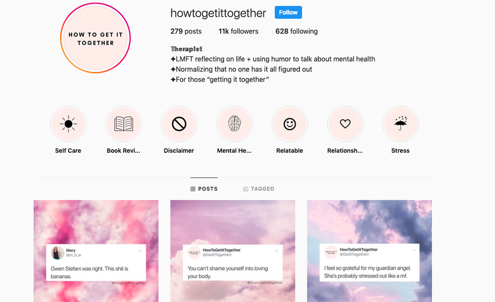 The owner of the page @howtogetittogether is a marriage and family therapist that posts inspirational (and funny) posts basically every day. My favorite is "Gwen Stefani was right. This shit is bananas."