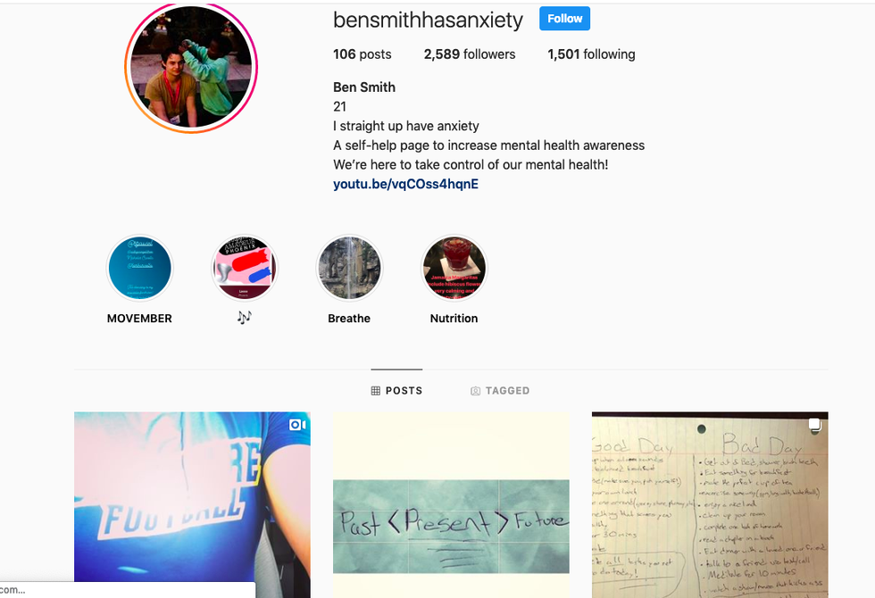 Ben goes to college near me. I heard of his account from a friend and I've been obsessed with it since. He is unashamed of his anxiety and wants to ensure that others know to reach out.