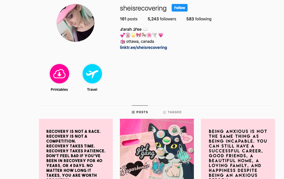 Sarah Lee, the owner of this account, posts inspiring messages for people who are in mental health recovery. I love the pink too!