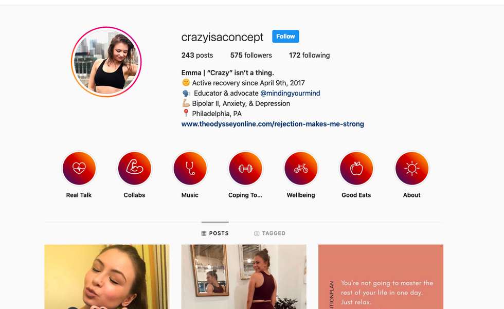 Temple's Odyssey President, Emma, has a mental health account called @crazyisaconcept. I love how real she is on this account and I encourage you to check it out if you are in recovery, or simply want to support others with mental illnesses or mental health problems.