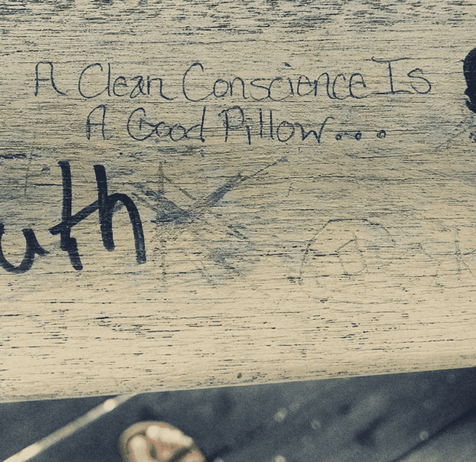 This past August I spent hours in the hot summer sun inspecting all the “420” quotes and phallic graffiti that was scribbled all over a bannister at our local park. Graffiti is expected there. It’s almost like art. Except some of it is kind of vulgar. Some people write their initials in a heart and other people write anything and everything that refers to penises and pot. In the midst of all that, I found this little quote: