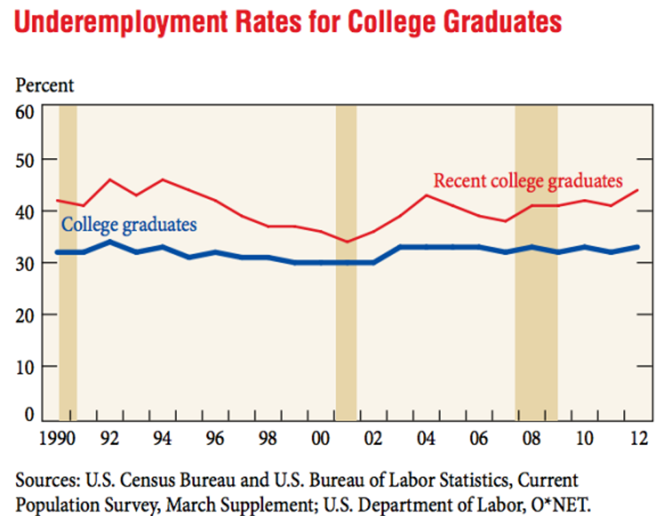 Since the Great Recession, recent college graduates have taken a huge hit in job prospects after graduation. Even years after the Great Recession, college graduates are still struggling. Stagnation in job prospects are an alarming reality for students who are entering college, about to graduate, or have recently graduated. Even the graduates who find jobs may find themselves working part-time jobs because they cannot find full time employment; in other words, they many find themselves underemployed. Underemployment is simply when one finds oneself jobless or looking for work.The most common form of underemployment is when recent graduates are overqualified for the position they are filling. According to an article by Slate, a report by the Federal Reserve Bank of New York recorded that 44 percent of graduates with a bachelor's degree, between the ages of 22 to 27, were performing in a job that did not qualify for a degree.