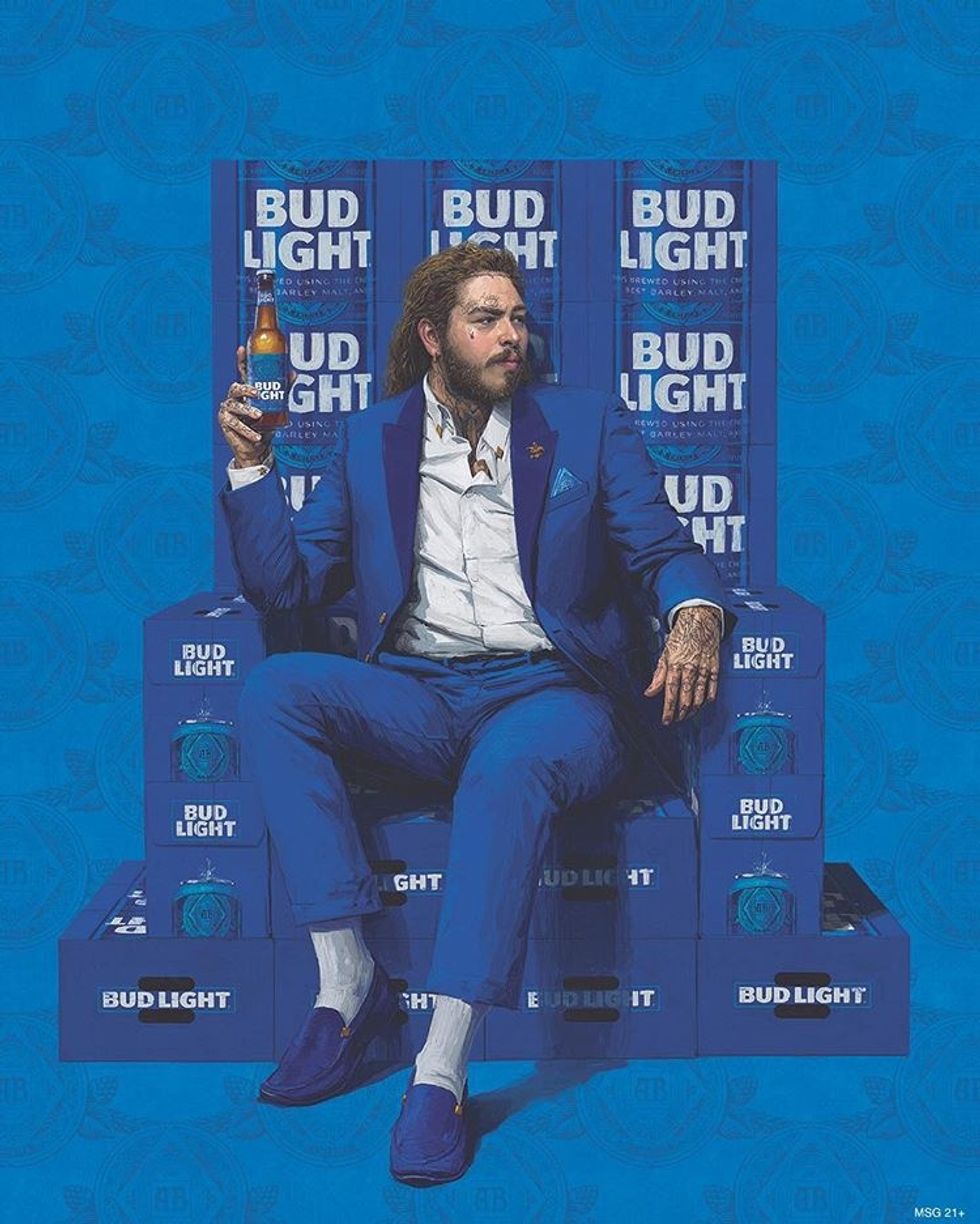 Post Malone will only ever be seen drinking Bud Light. It is rare to see a photo of him without a Bud Light in his hand. He attends all sponsored Bud Light events and does a performance.
