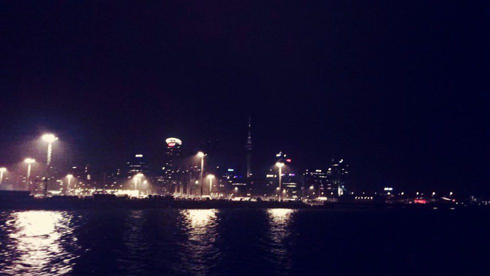 Now, to offer a bit of contrast, here's another shot of the very same skyline - taken from about the same angle, but at about midnight, as I was taking the ferry back to the Island I live on after a day's work in the city. May or may not have been completely sober by the time this was taken, but nevertheless the photo turned out well. Take notice of the Sky Tower peeking out in the background - much like Seattle's space needle. My favorite thing of a calm night on the ferry is the bright reflections of lights across ripples of water in the bay.