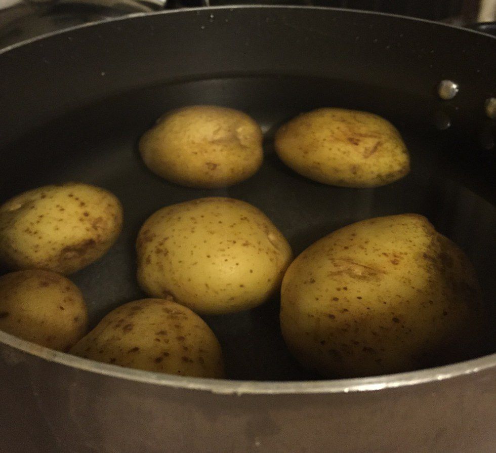 Set heat to medium-high. As soon as the water is close to or starts boiling, turn it down. Now you just want your potatoes to simmer. You don't want the tragedy of overcooking to occur again, especially not at 2:30 a.m. in the morning. I would say leave them for a good 10 minutes. Then take a spoon and knife to check how firm a piece is. It should be firm enough that it has a nice shape and won't fall apart, but not so firm that it's difficult to cut through. Once you have achieved this, take your pot and replace the hot water with cold, and let cool.