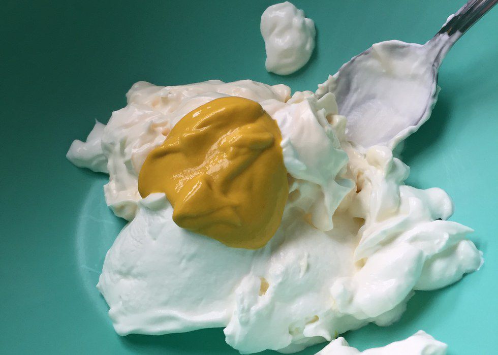 5. In another bowl, mix the sour cream, mayonnaise, and mustard.