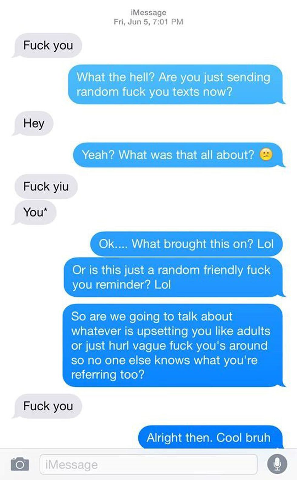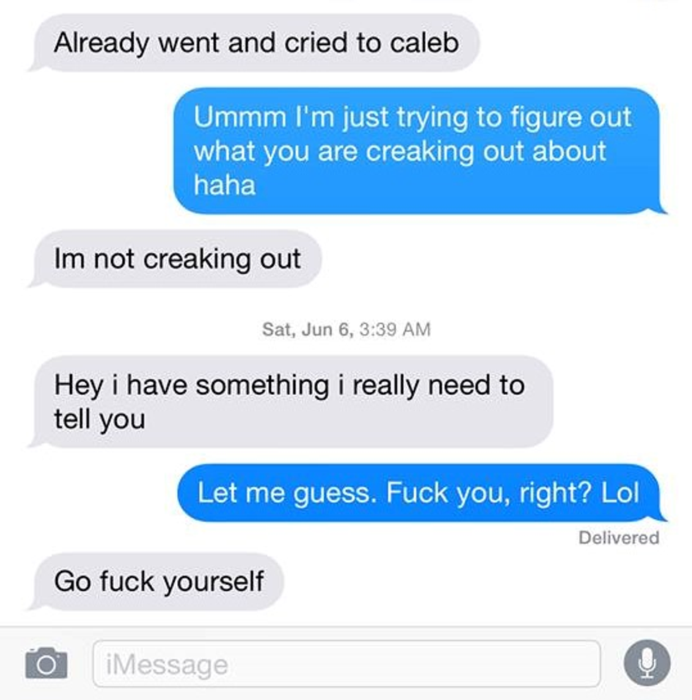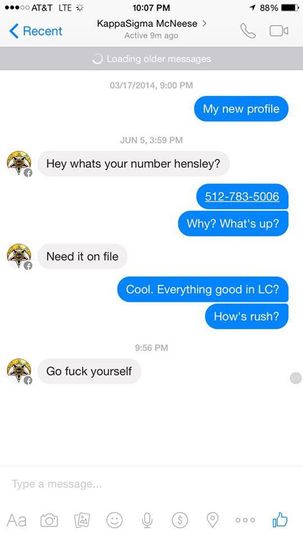 "Hey there, Hensley. This is (name) from the old Kappa Sigma House and I was just wondering why you blocked my number and me from Facebook. You know I’m just having fun and joke around with you but you have to be a little queer and block me from everything. So how about you unblock me so we can talk it out like you want too, like adults. So yeah, just call me back.”
