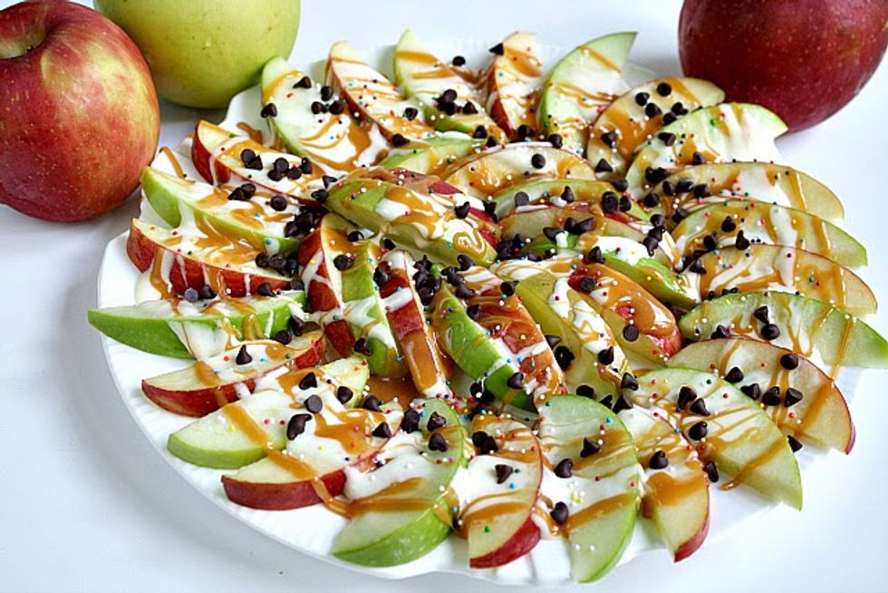 2. Melt peanut butter for 30-second intervals in the microwave, then drizzle over apple slices.