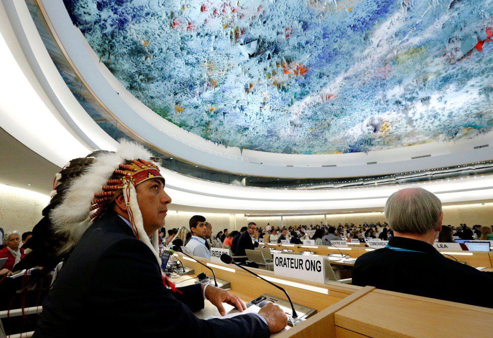 Standing Rock Chairman, Dave Archambault II waiting to give his speech opposing the Dakota Access Pipeline at the Human Rights Council at the United Nations in Geneva, Switzerland September 20, 2016.