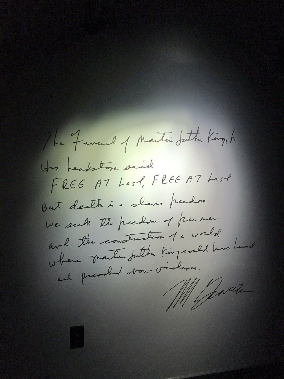 The “Rolls Down Like Water” gallery of the Civil Rights Movement continues in a similarly powerful fashion with videos from the great March on Washington and blurbs about both high-profile and lesser-known advocates. It ends with the death of Martin Luther King, Jr. and tucked away from the crowd and the recordings, I find a wall painted with Nikki Giovanni’s poem.