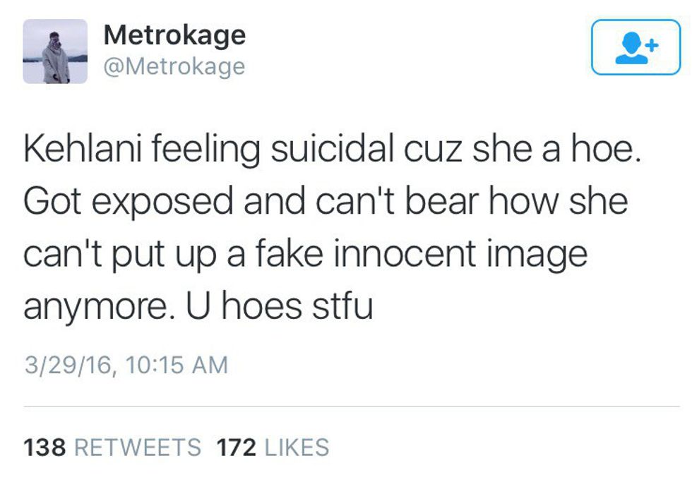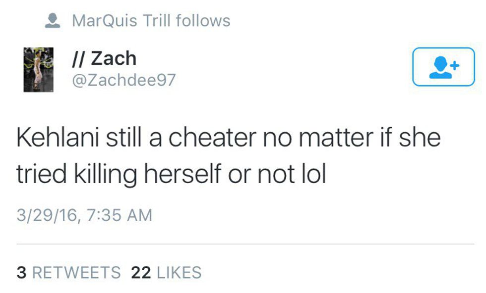 Regardless of if you believe she cheated on her boyfriend or not, suicide is a serious issue. Kehlani, like many others, have tried to attempt suicide because they feel voiceless. Someone's mental health is no joking matter. Fans need to be reminded that celebrities are human beings as well. People should not sit behind a computer screen and completely demean another person's character.
