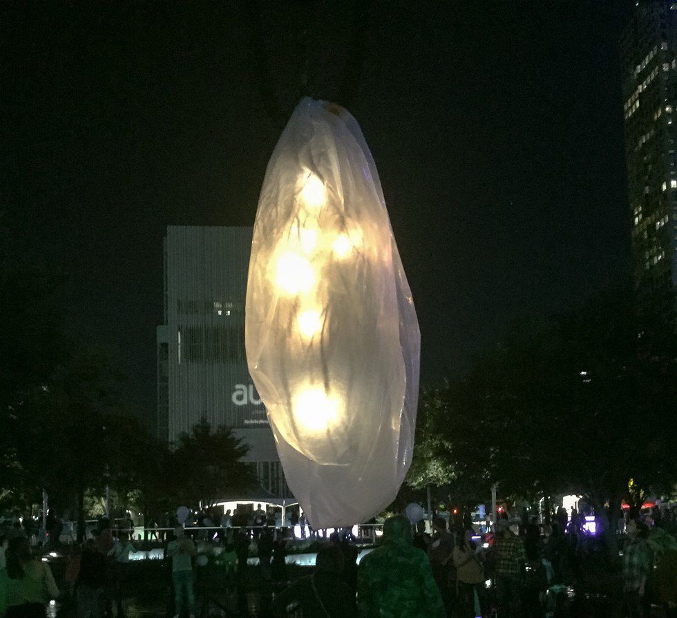 Another piece that caught my attention was Montréal artist Herman Kolgen's Unwind. What you see is a large cocoon like object suspended above the pool facing the AT&T Performing Arts Center, and inside that cocoon is a tree. The tree is wrapped in lights and hooked up to an artificial respiration system that breathes with the wind and the people around it. It ends up resembling a heart beating, a lung respiring, or (to get sci-fi again) Mothra waiting to emerge from his chrysalis.