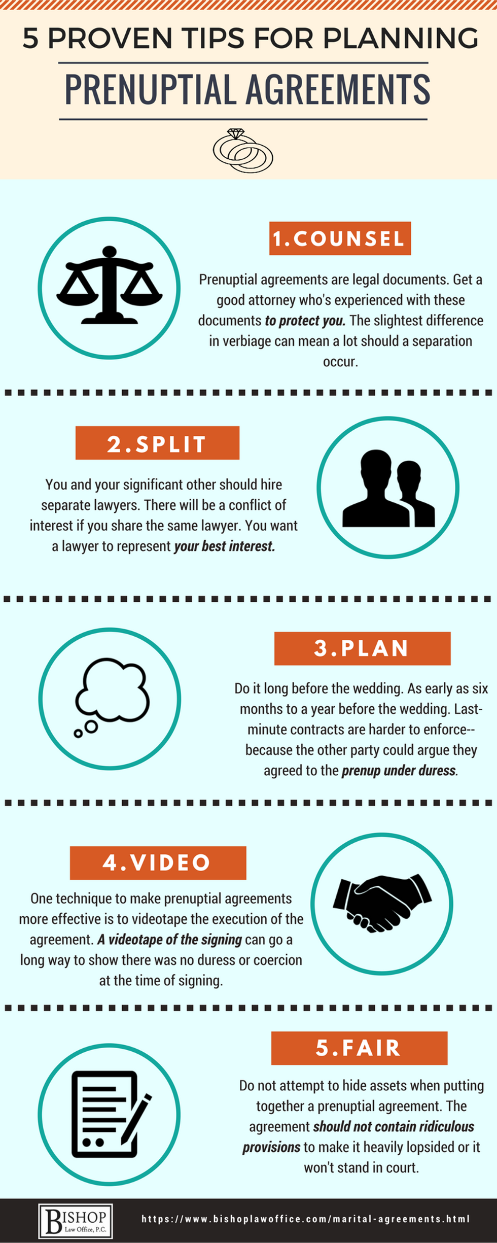 Here is a helpful infographic made by Bishop Law Office with tips to planning an effective prenuptial agreement: