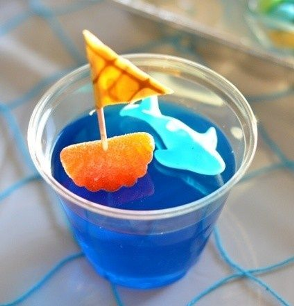 These are super easy and quick treats that will make a Shark Week party sharktacular. You will need blue jello mix (red if you want to add blood), shark gummies (can be found at 7/11), transparent cups and any other candy you would like to add for decoration.