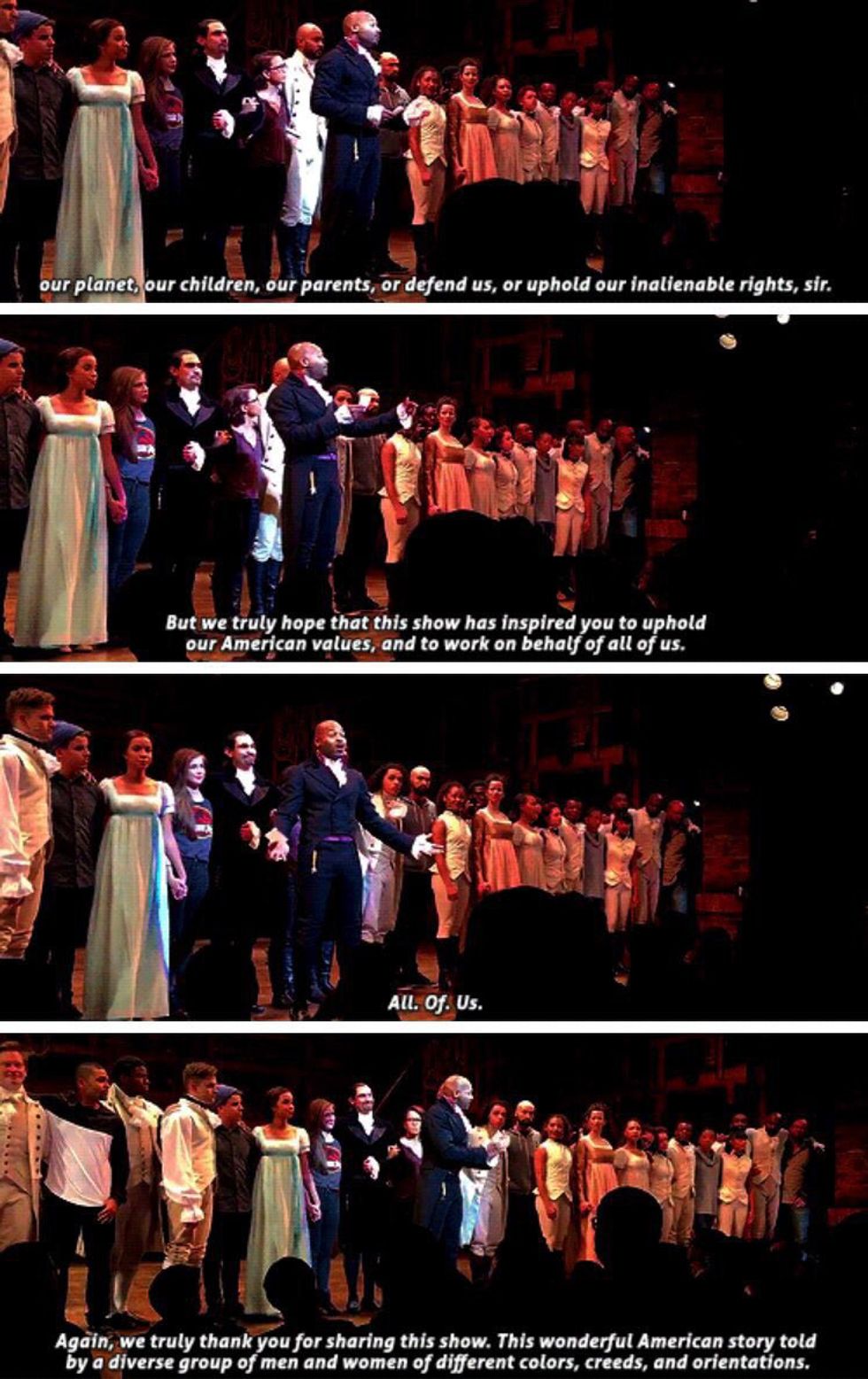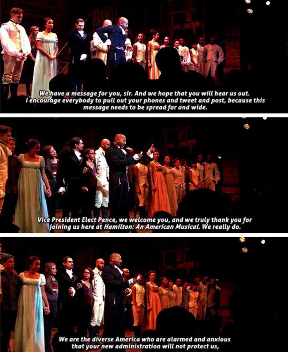 Lately, instead of focusing on the important issues in our nation, the President-elect has turned his attention on Hamilton, the Broadway musical that has taken the world by storm. During a show this past weekend, the cast took time at the end of the show to point out Vice President-elect Pence in the audience and gracefully welcome him and thank him for seeing the show. Brandon Victor Dixon, the actor who portrays Aaron Burr, then told Pence that "[they] are the diverse America who are alarmed and anxious that [his] new administration will not protect [them]" and that they "truly hope [Hamilton] has inspired [him] to uphold our American values and to work on behalf of all of us." Trump quickly went on Twitter to express his feelings about their speech, saying that the cast "harassed" Pence "cameras blazing" being "very rude," then proceeded to call the musical overrated and demanded an apology for their behavior.