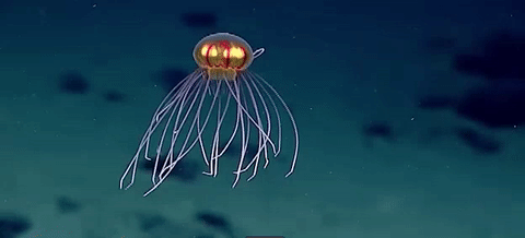 Its body is illuminated in red and yellow while short and long tentacles dangle below it.