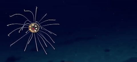 This jellyfish belongs to the genus Crossota and it has two sets of tentacles. In the video, the jellyfish has its long tentacles extended while its body stays still. That behavior suggests it hunts by ambushing its prey, according to scientists.