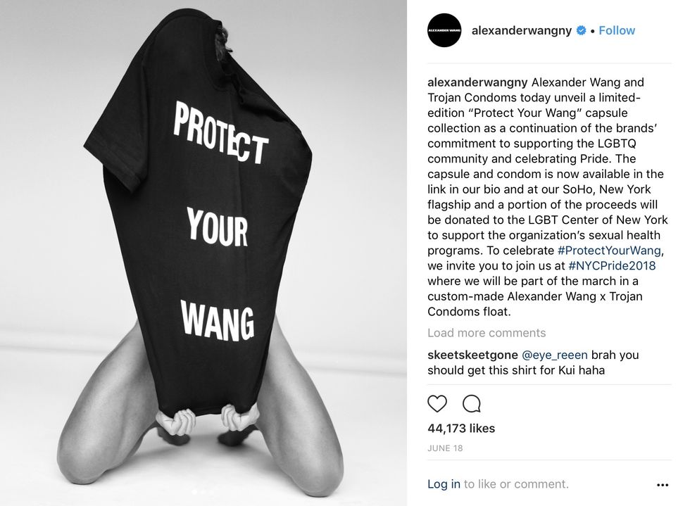 "Pride has always been one of my favorite moments of the year, and it's even more amazing when you can engage with your friends and fans to share an important message that promotes wellness within the LGBTQ community," Alexander Wang states in a press release. "Partnering with Trojan to bring the 'ProtectYourWang' collection to life has been an inspiring way to create products that have further purpose in supporting initiatives we are both passionate about."