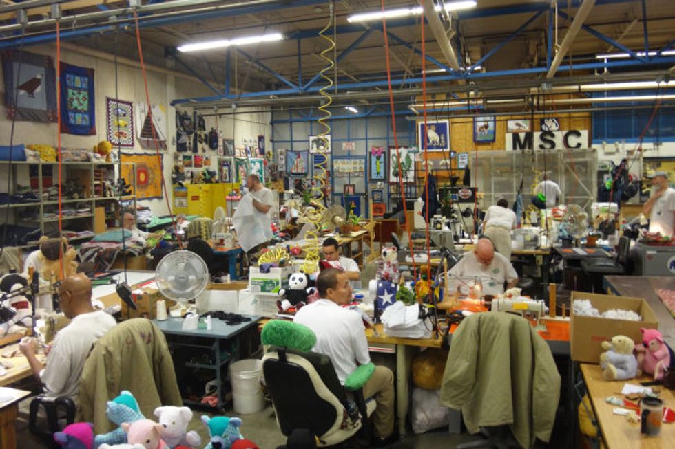 We were shown a greenhouse area that grows produce for the prison cafeteria, a bike repair station that fixed bikes for underprivileged kids, a woodshop that fixes chairs and equipment for nonprofits, a compost bin trying to keep the prison green, and even a teddy bear workshop that repurposes old prison uniforms into stuffed animals for children in need. Unlike anywhere else in the prison, everyone seemed relaxed and happy to be there. The inmates chatted with each other and the corrections officers alike, whenever we got to a new station, there would be someone eagerly putting down their work and coming over to tell us all about it. After visiting the sewing station the workers insisted we each take a stuffed animal as a keepsake. As we left a wood sculptors workshop, I overheard Jack thanking him for his time and the man replying “made my day.”