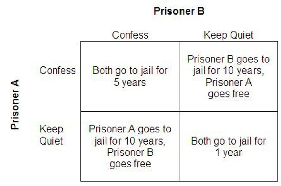 Two people are charged with robbing a bank and are separated in a jail house. A detective offers them both the same decisions either confess to the crime or stay quiet. If both of them stay quiet, each will receive a 5 year prison term because they have enough evidence to jail them for illegal weapon possession. If one confesses and the other stays quiet, the confessor will go free for their contribution to the case and his partner will serve a 15 year sentence for bank robbery. Lastly, if both perpetrators confess, then each will serve a 10 year sentence for committing the bank robbery but have the 5 years deducted for cooperating with the police.