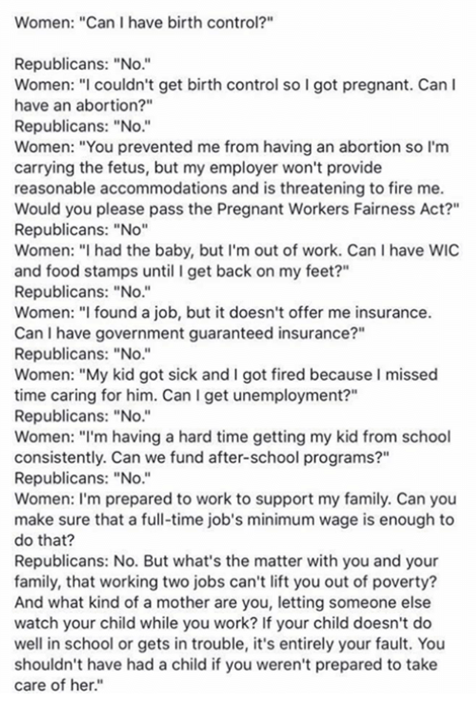 But this is not the case. Even getting your birth control covered by your insurance is not a guarantee (and what of the people who don't have insurance, or are on their parents' till 25 and don't have parental support to get birth control?), let alone having access to free birth control. And when given the opportunity to actually reduce abortion rates by forty-two percent by merely funding IUDs, the Colorado GOP voted against such a program.