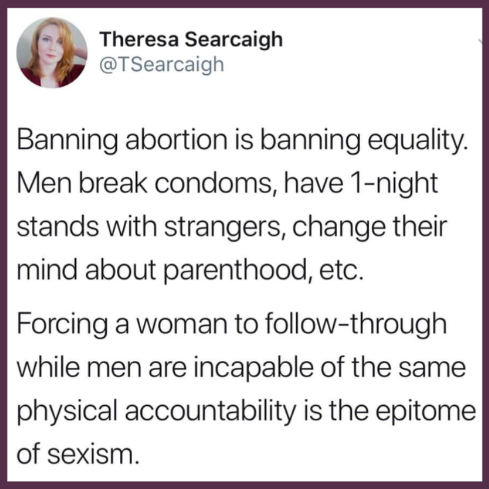 In all these abortion bans, where are the expectations of men? Where is male inclusion and responsibility for the life he has caused in these laws? After all, 100% of pregnancies result from a man's choice to have sex and his subsequent enjoyment of it. A woman's enjoyment of the act is not even a factor in pregnancy biologically. Pregnancy can occur during rape—you cannot get more anti-enjoyment or choice than that.
