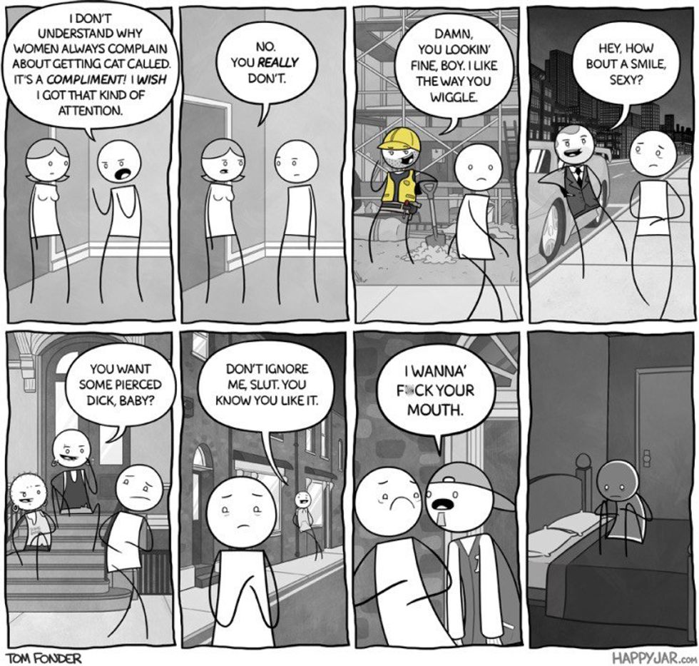 Why it’s creepy harassment: I am not your baby. I don’t want to be your baby (hence why I’m walking past you). I don’t need you to tell me I have a nice ass, and I didn’t ask for your opinion. Quite frankly, it's plain creepy to tell any stranger they have a nice ass.
