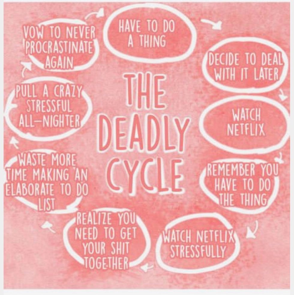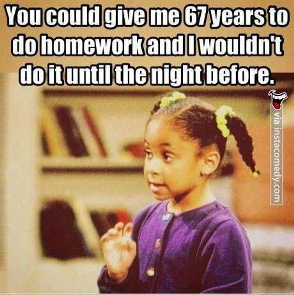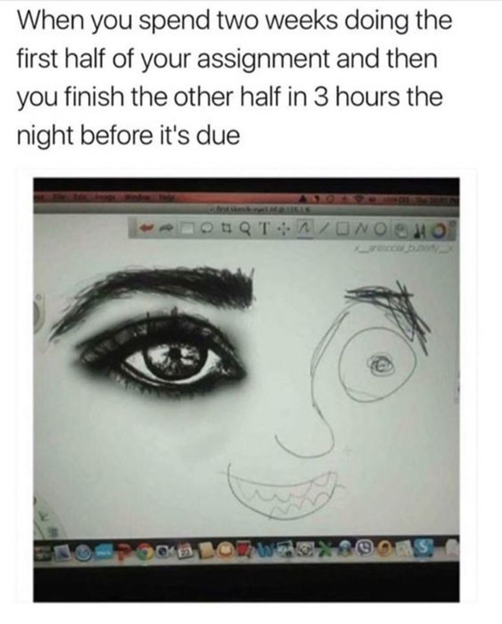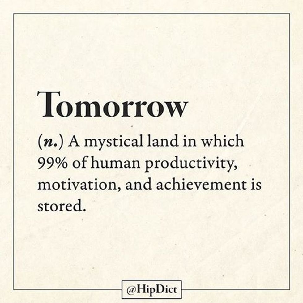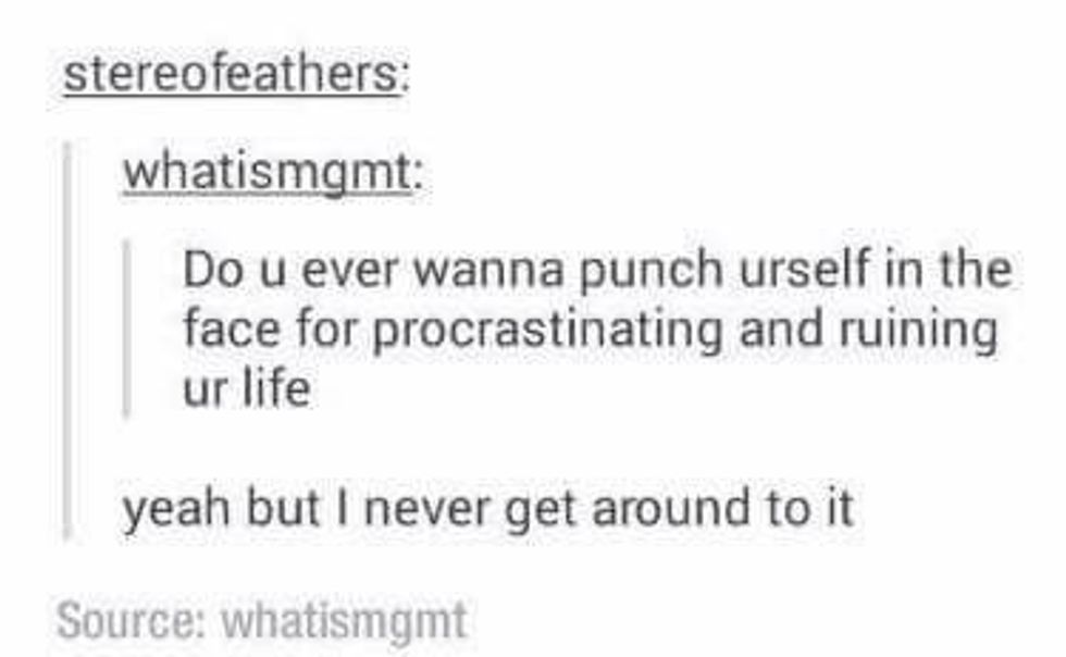 So, the moral of the story that I wasn't even telling is that while procrastination is funny while you are procrastinating it is actually a very real, intense, life-altering fear when procrastination has stopped being funny and become very, hella real and I'm going to stop typing now because I've reached my five hundred word quota.