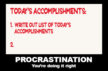 For those like me, afflicted with the illness of procrastination, the excuses to evade work are endless and it is impossible not to attempt to exhaust each and every one of them. While it is difficult to understand, our lifestyle is not a choice. There exists a genuine uncontrollable and powerful resistance within us that prevents our minds from thinking, our hands from typing, and our eyes from reading. It is impossible for us to bring ourselves to do work when there is a girth of other, less painful and boring "not work" to do, even when the situation becomes dire.