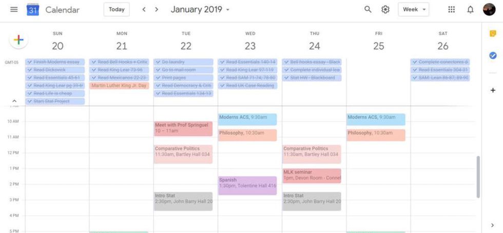 This is my weekly view on Google Calendar. Things are grayed out because this is an old week's schedule. My classes are color-coded and time-scheduled. I have the location of my classes as description.
