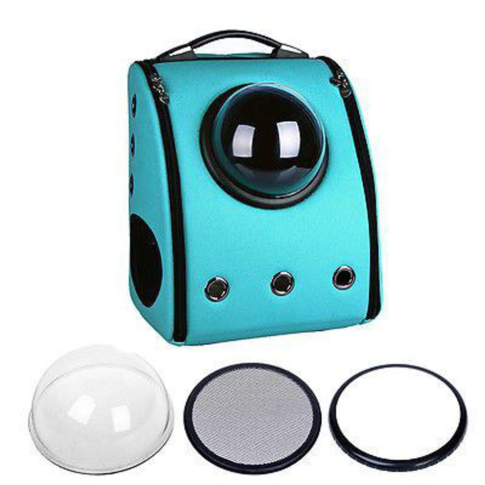 This is real. And, it has interchangeable windows. How does one get a cat in this contraption? My cat doesn't even like to be held too long. And where are you going that you have to bring your cat along for the ride?