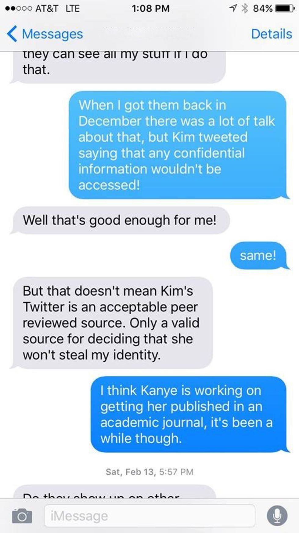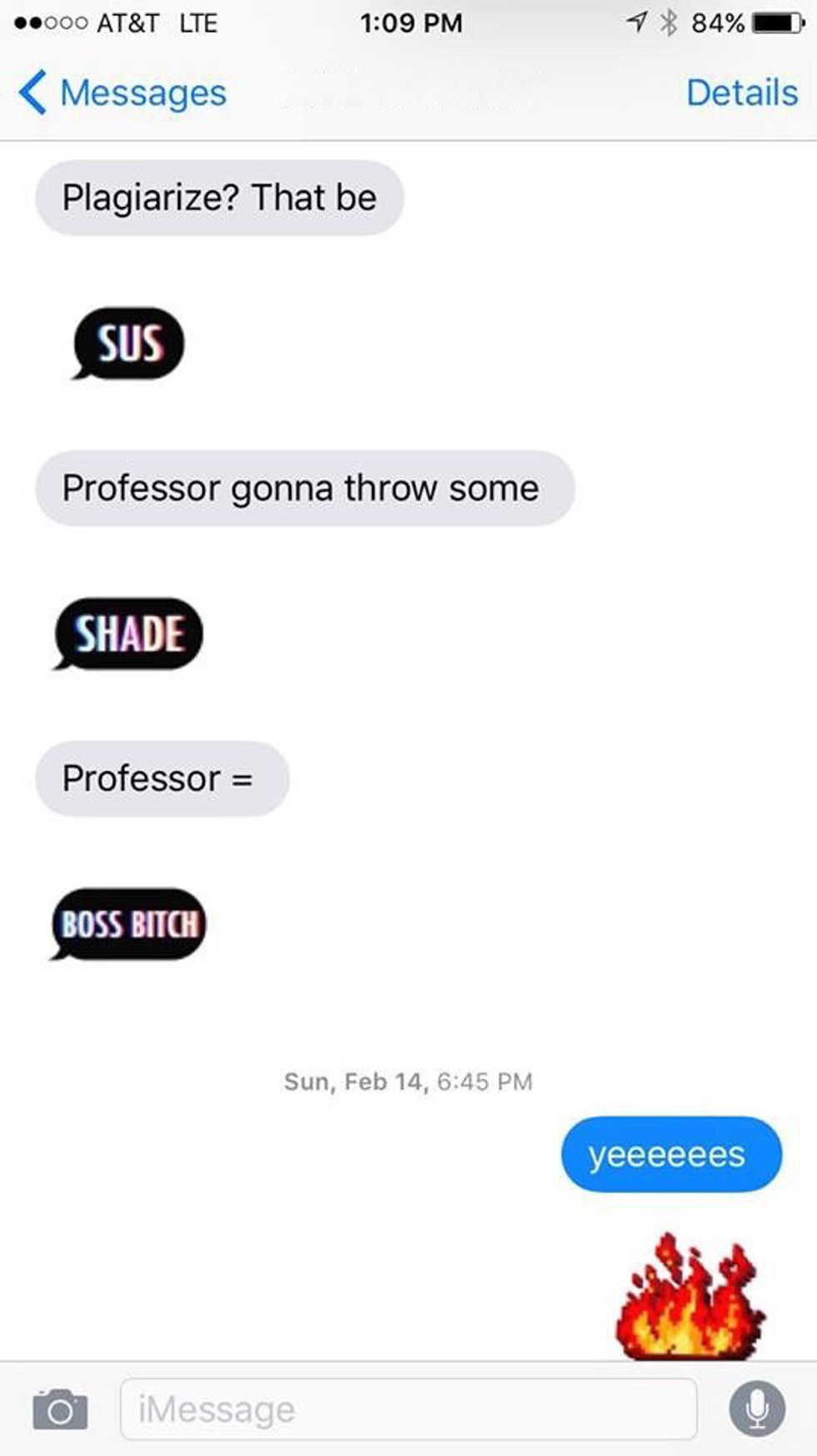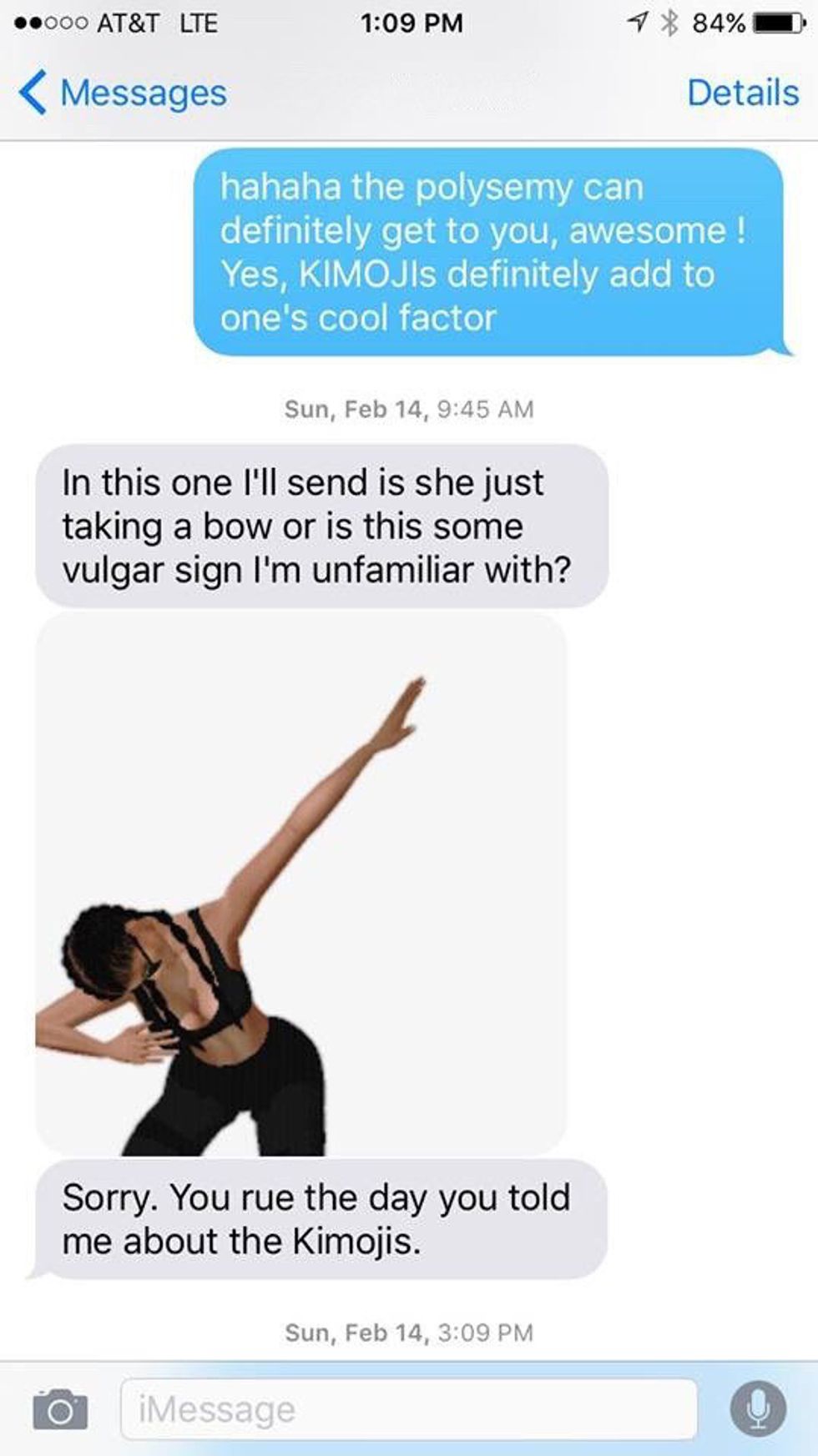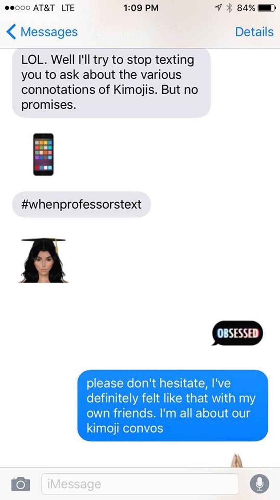 Fast-forward to today, as I conducted research for Capstone, I received a random text from my professor on Saturday, February 13. The rest is history. Enjoy the screenshots below of a student/professor KIMOJI convo below. Who says professors can't be cool?