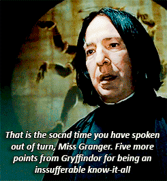 Throughout the saga, Professor Snape was the potions master. He had a natural disdain for Gryffindor which probably stems from the fact that Harry's father bullied him in Hogwarts. Hermione Granger, who was extremely smart and challenged pretty much anyone, was apart of Gryffindor. So, when Hermione continuously spoke out of turn, Snape had a response for her.